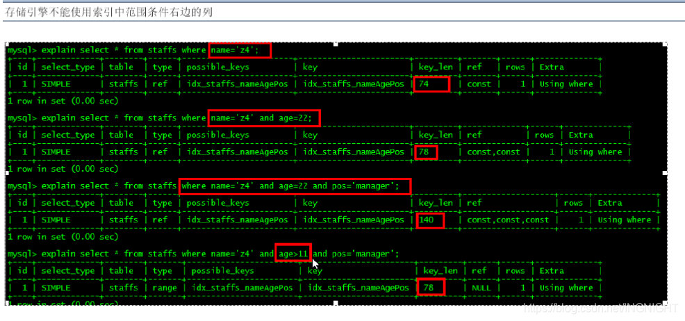 ✈ 总结:当索引是按照name,age,pos顺序建立的时候,如果查询条件是以name开头,但是没有按顺序,就会导致后面的索引失效。总结一句话就是:中间兄弟不能断!