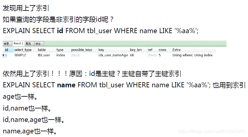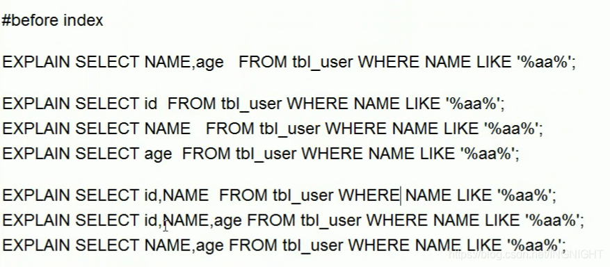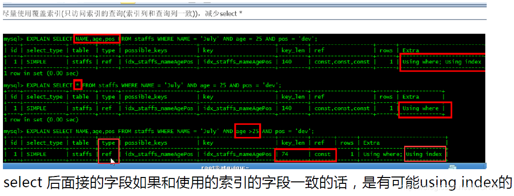 尽量使用索引的查询即索引列和查询列一致,减少select *