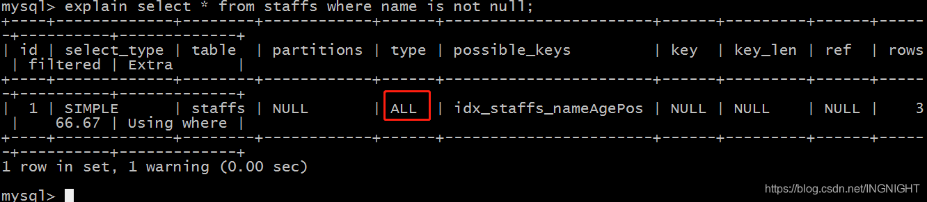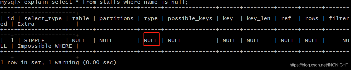 explain select * from staffs where name is null;