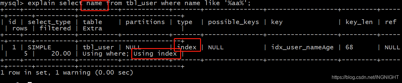 explain select name from tbl_user where name like '%aa%';