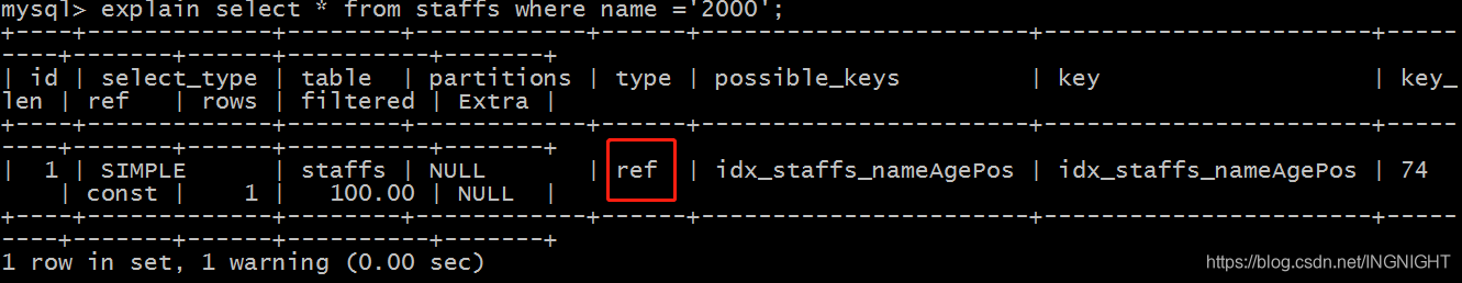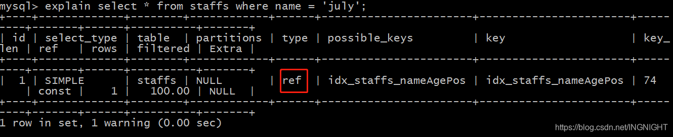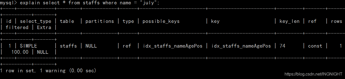 explain select * from staffs where name = 'july';