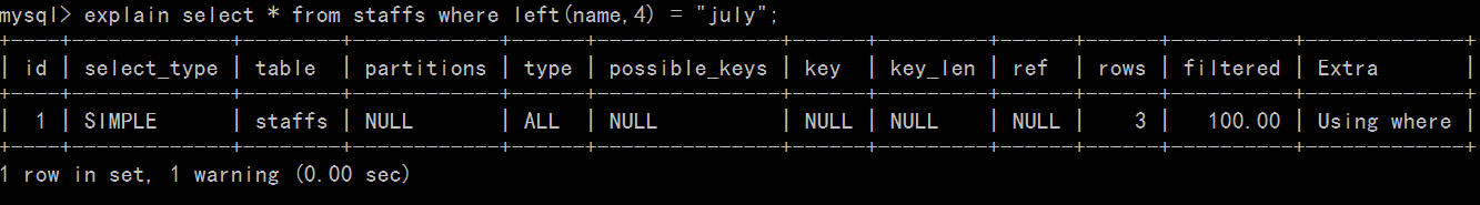 explain select * from staffs where left(name,4) = "july";