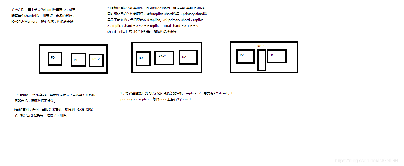 (5)3台机器下,9个shard(3 primary,6 replica),资源更少,但是容错性更好,最多容纳2台机器宕机,6个shard只能容纳0台机器宕机