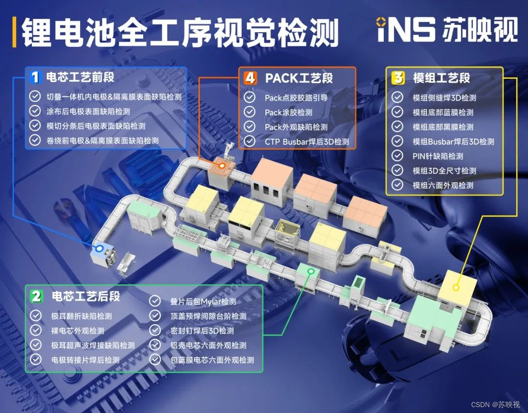 苏映视为锂电池生产全工序提供20+项视觉解决方案,方案包含缺陷检测、尺寸测量、视觉引导、字符识别等功能,覆盖电芯前段、电芯装配段、模组段、Pack段等整个生产工序,助力锂电池产能加速,为电池的安全和寿命保驾护航。