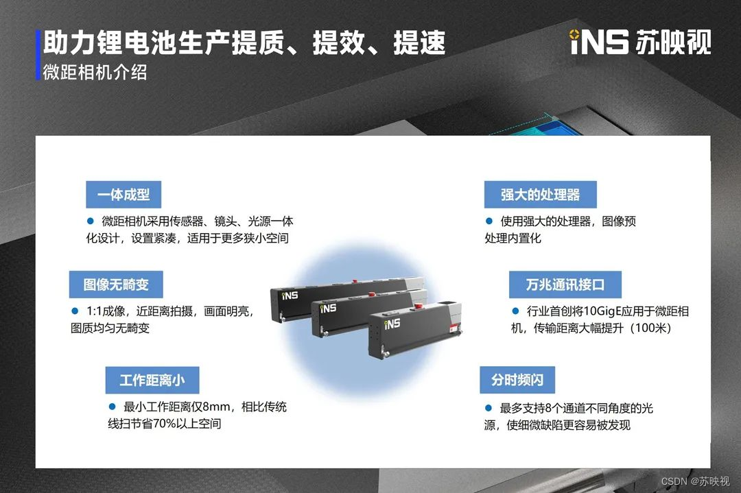 苏映视产品总监华雪受邀携公司自研的微距相机、大景深相机亮相,并作题为《微距相机创新性助力电芯前段缺陷检测降本增效》的精彩演讲,干货满满。华雪表示苏映视自主研发的INS-CHVS系列微距相机凭借其一体成型、微距、宽幅、无畸变、分时频闪等优势为锂电行业解决极片检测大幅面多相机拼接、隔膜复卷机狭窄安装空间、漏涂与孔洞检测等痛点问题,助力锂电池生产提质、提效、增速。
