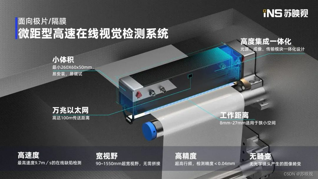 苏映视在国内首次推出INS-CHVS系列微距型相机及视觉检测系统,该相机集光源、镜头、 传感器、微调高机构一体化设计,可灵活安装、快捷部署。搭载万兆以太网接口,电缆长度可伸展至100m,实现大量数据即时传输。微距相机成像清晰不失真,在一次扫描取像中获取多种光源类型图像,消除环境干扰,增效捕获瑕疵。