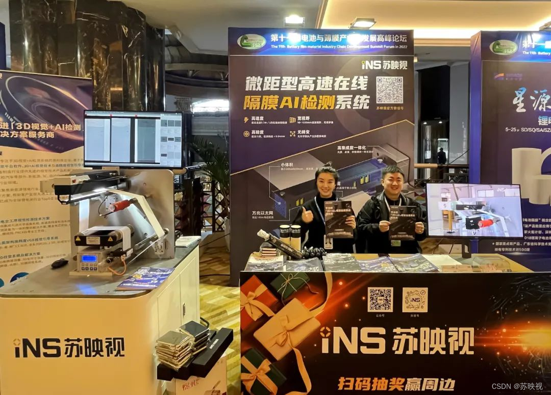 作为锂电行业「3D+AI」视觉检测系统专业服务提供商,苏映视针对锂电前段工序中隔膜、铜箔、铝箔等材料的表面缺陷检测问题自主研发的「微距相机及AI高速在线检测系统」在会议期间获得了电池与膜材料生产商等与会人员的高度关注及认可。