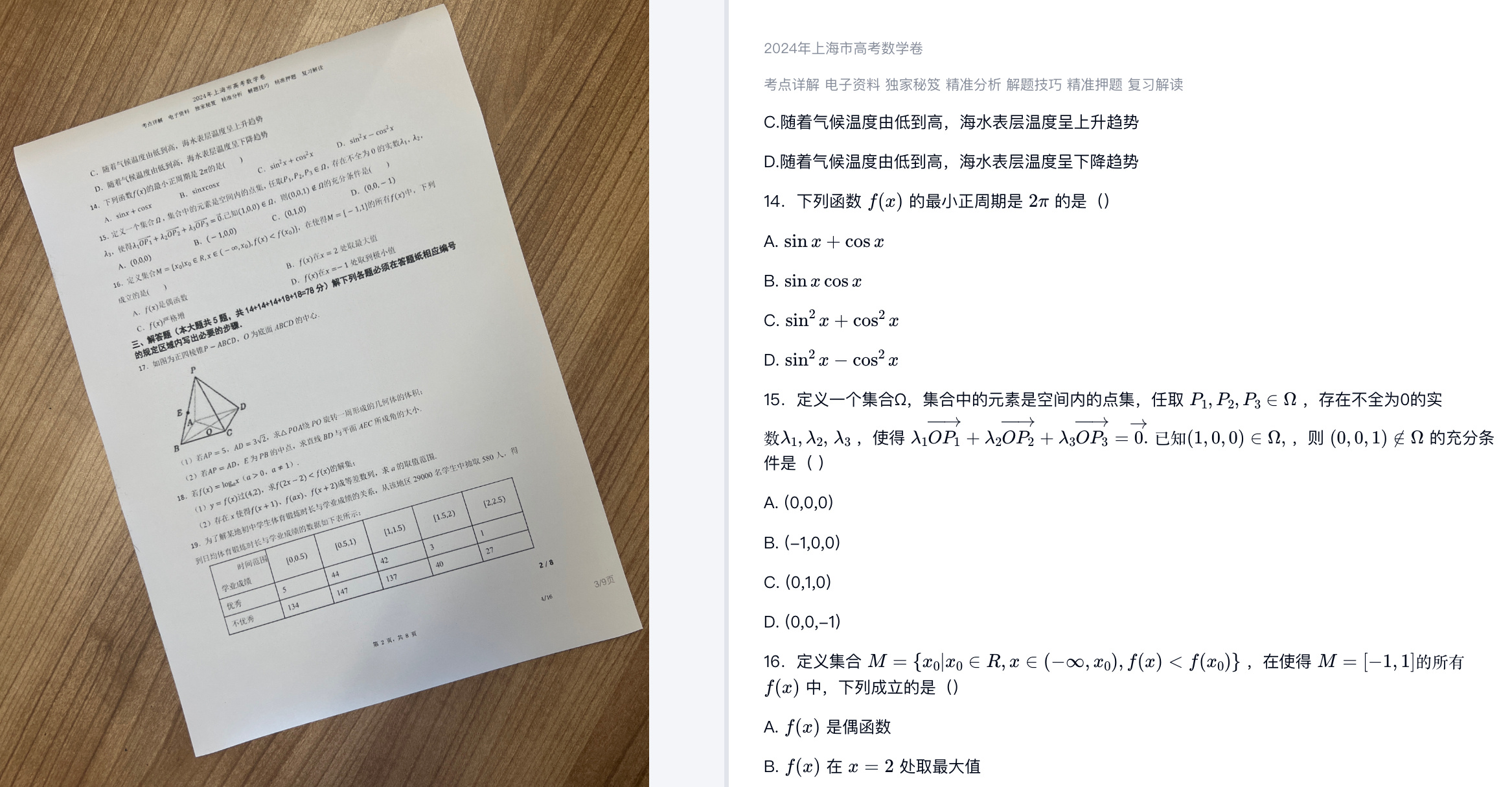 如下可以看到一份数学试题的传统OCR识别结果与文档解析输出结果: