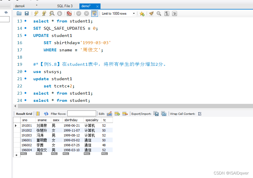 #【例5.8】在student1表中,将所有学生的学分增加2分。