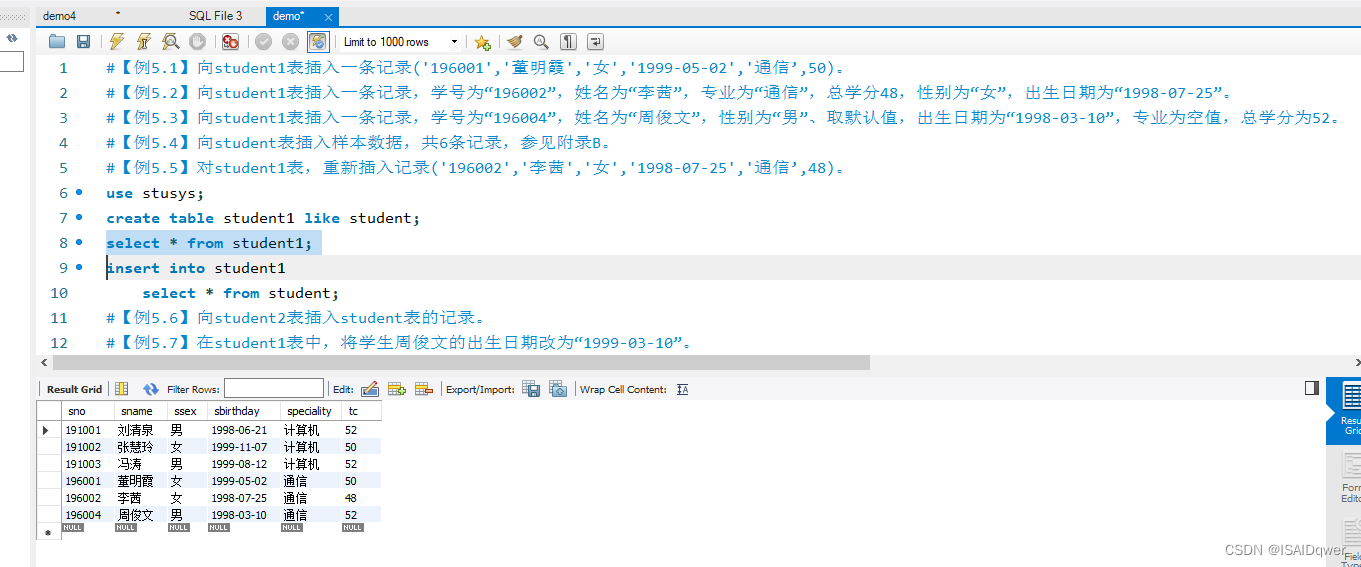 #【例5.5】对student1表,重新插入记录('196002','李茜','女','1998-07-25','通信’,48)。