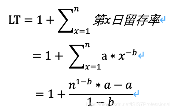 后续每天的留存率是一条衰减曲线,可以用幂函数y=a*x^(-b)拟合,对幂函数求积分获取曲线下方的面积,即为上述公式。