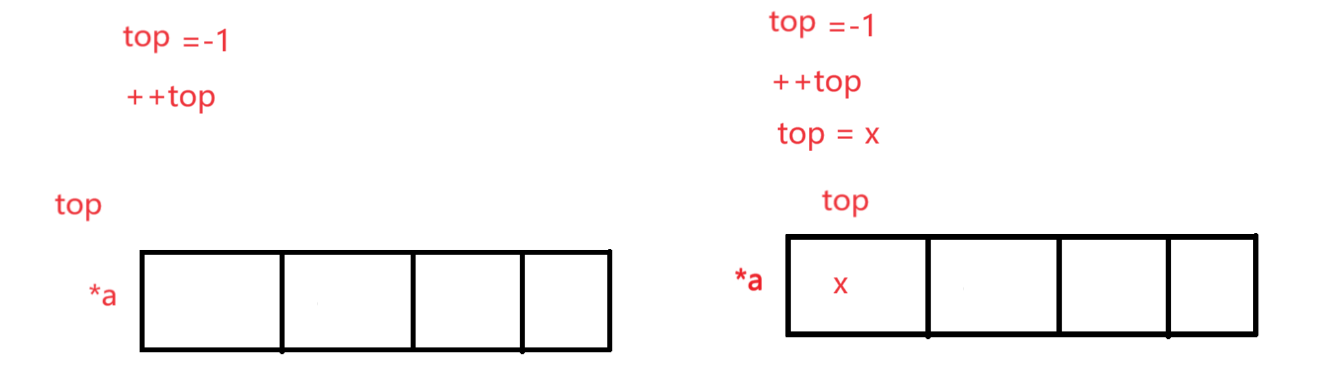 因为我们这边使用的是顺序表的结构,所以在插入数据时要注意容量空间问题,此问题顺序表章节有介绍,这边不再赘述了,我们在初始化时top是-1,那插入数据时一定要先++后访问下标位置,以防不理解,这里也给上图: