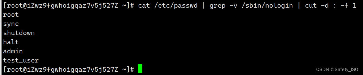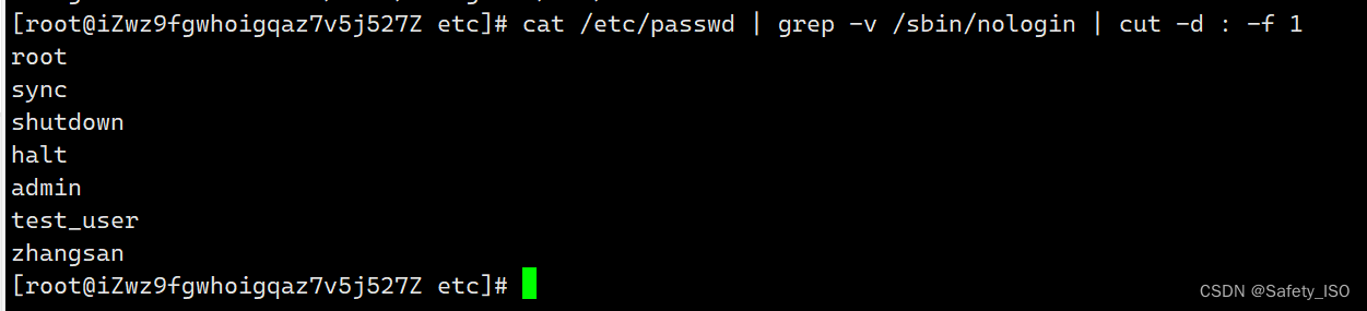 指令:cat /etc/passwd | grep -v /sbin/nologin | cut -d : -f 1