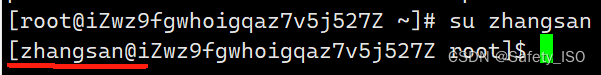 1.红线部分可以发现用户已经切换成zhangsan的了。2.切换用户时目录是上一个用户的当前位置。