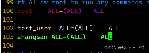 我们新建一个用户时,权限是非常低的,像yum等指令是无法使用的,但我们可以给用户设置白名单,文件的路径在root下的 /etc/sudoers 里,需要用vim进行添加,进入文件里只需要按照以下方式进行添加即可([用户名] ALL=(ALL) ALL),如希望sudo时候不需要输入密码只需要将最后一个ALL改为NOPASSWD:ALL(不推荐)。