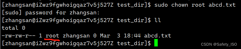 指令:sudo 【指令】,如:sudo touch normal.txt