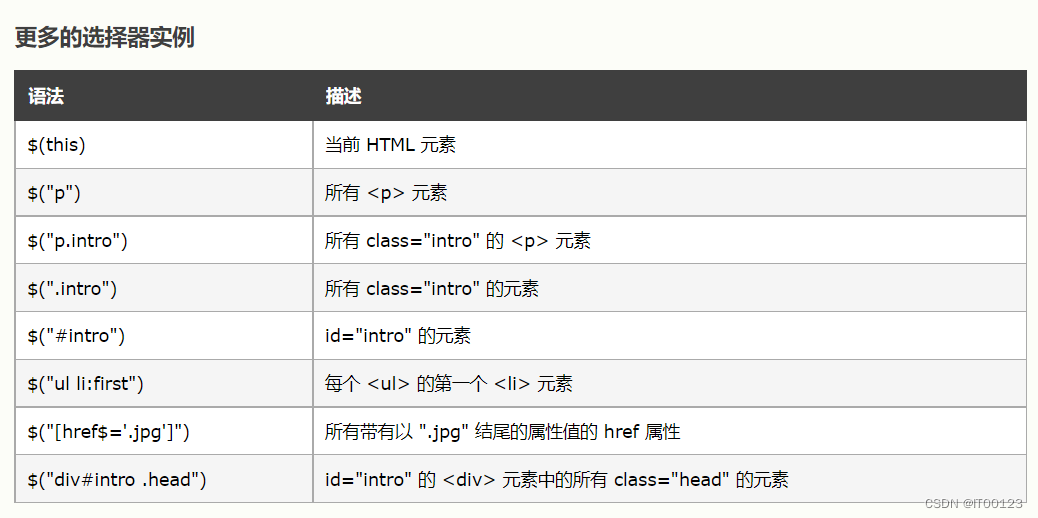 $("p.intro") 选取所有 class="intro" 的 <p> 元素。