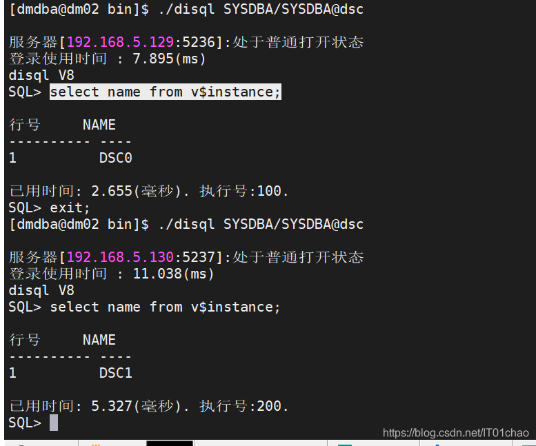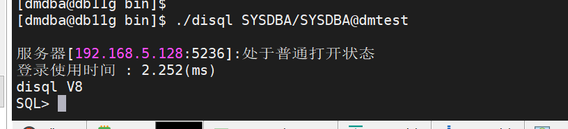 [dmdba@db11g bin]$ ./disql SYSDBA/SYSDBA@dmtest