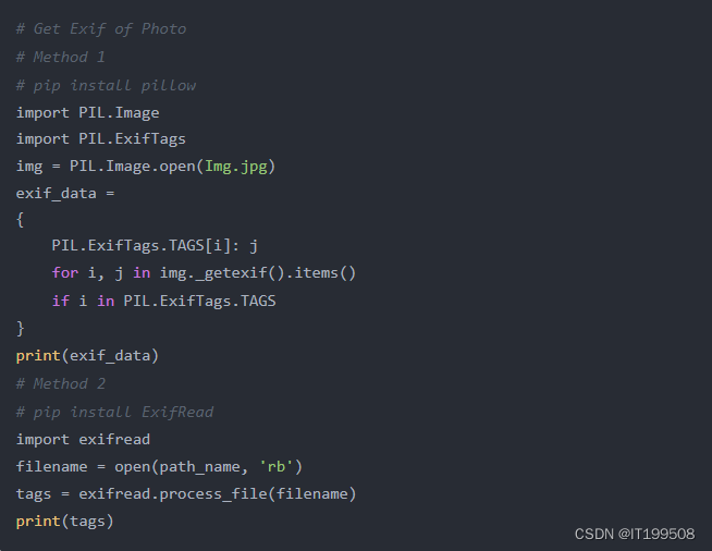 使用 Python Pillow 模块获取任何照片的 Exif 数据。查看下面提到的代码。我提供了两种方法来提取照片的 Exif 数据。