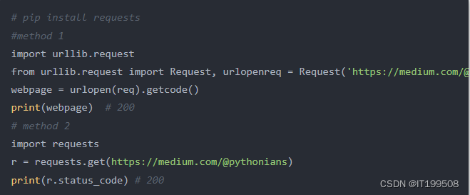 你可以使用 Python 检查网站是否正常运行。检查以下代码,显示200 ,表示网站已启动,如果显示为 404 ,则表示网站已关闭。