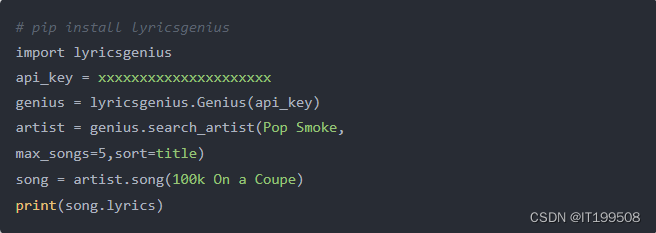这个高级脚本将向你展示如何从任何歌曲中获取歌词。首先,你必须从 Lyricsgenius 网站获得免费的 API 密钥,然后,你必须遵循以下代码。