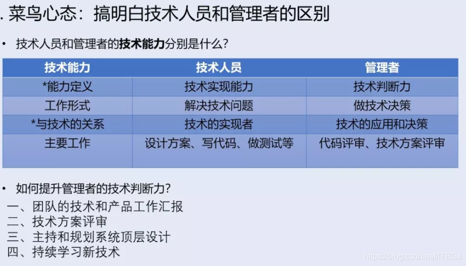 从能力定义上看,技术人员的技术能力,是技术实现的能力,即写代码、做技术实现类工作;而技术管理者的技术能力,是技术判断力,即这个新技术要不要引入、这个架构合不合理,这个项目落地有哪些方面的风险等等,要做出判断。
