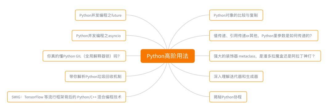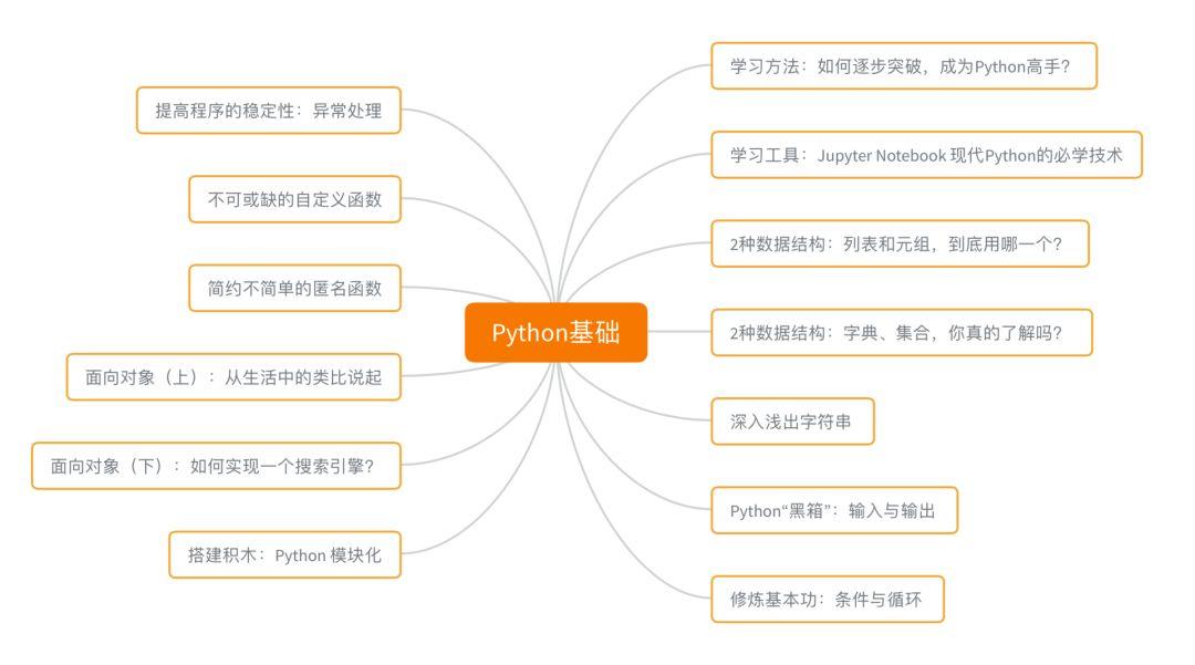 这个图谱出自于景霄的专栏 《Python核心技术与实战》 ,结合了他多年的工作经历,从工程角度,更为实战地梳理了Python核心知识点,从基础数据结构到装饰器、迭代器,再到并发编程、垃圾回收机制等等。可以说,跟着这套学习框架学,你会事半功倍掌握Python。