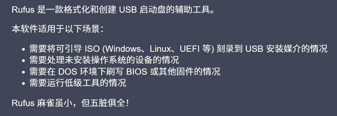 🔶 Rufus 是一个开源免费的实用小工具,可以快速制作U盘系统启动盘。它可以把 ISO 格式的系统镜像文件制作成可引导的 USB 启动安装盘,支持 Windows 或 Linux 启动。Rufus软件体积仅1MB左右,功能却相当丰富。