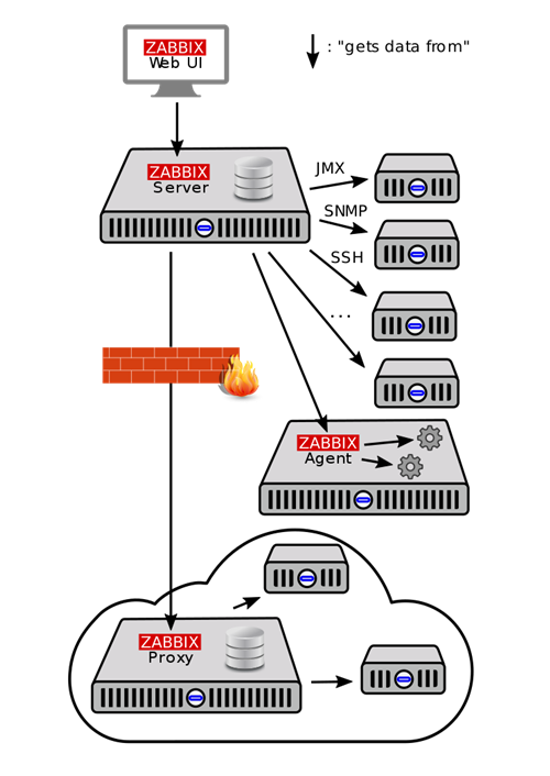5.Zabbix Proxy:当被监控节点较多时,用于减轻Server压力的组件,也用于分布式监控系统。由Proxy接收数据后统一发送至Server。