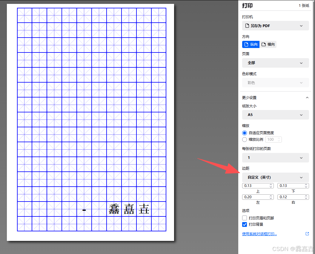 另:在打印时发现内容不居中,可以调整一下浏览器里的 “边距” 属性,自定义一下上下左右边距,使其居中