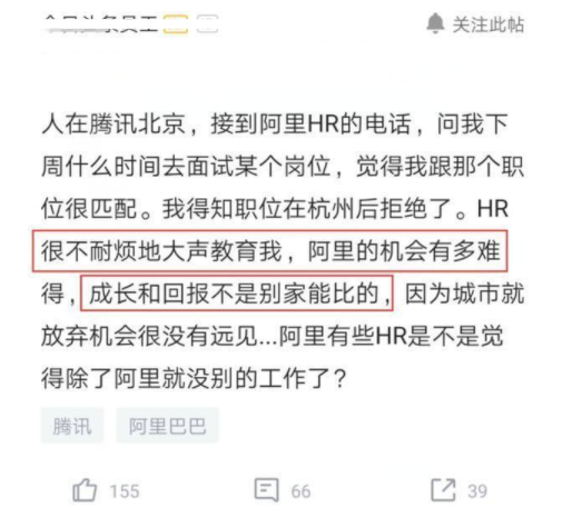 HR认为BAT这么好的工作,看到自己被拒绝,突然就开始教育这个员工,还说工作机会难得,仅仅因为城市的原因,你就这么不珍惜,也太没远见了。