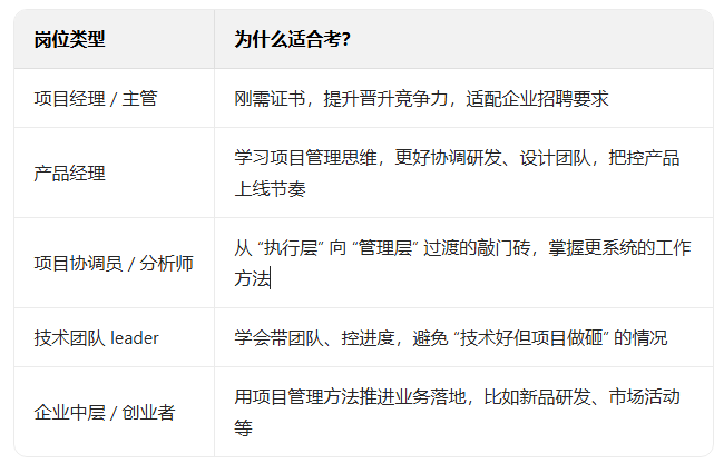 简单说:只要你需要 “带团队完成目标”“把控项目进度和质量”“协调多方资源解决问题”,PMP 就能帮到你。