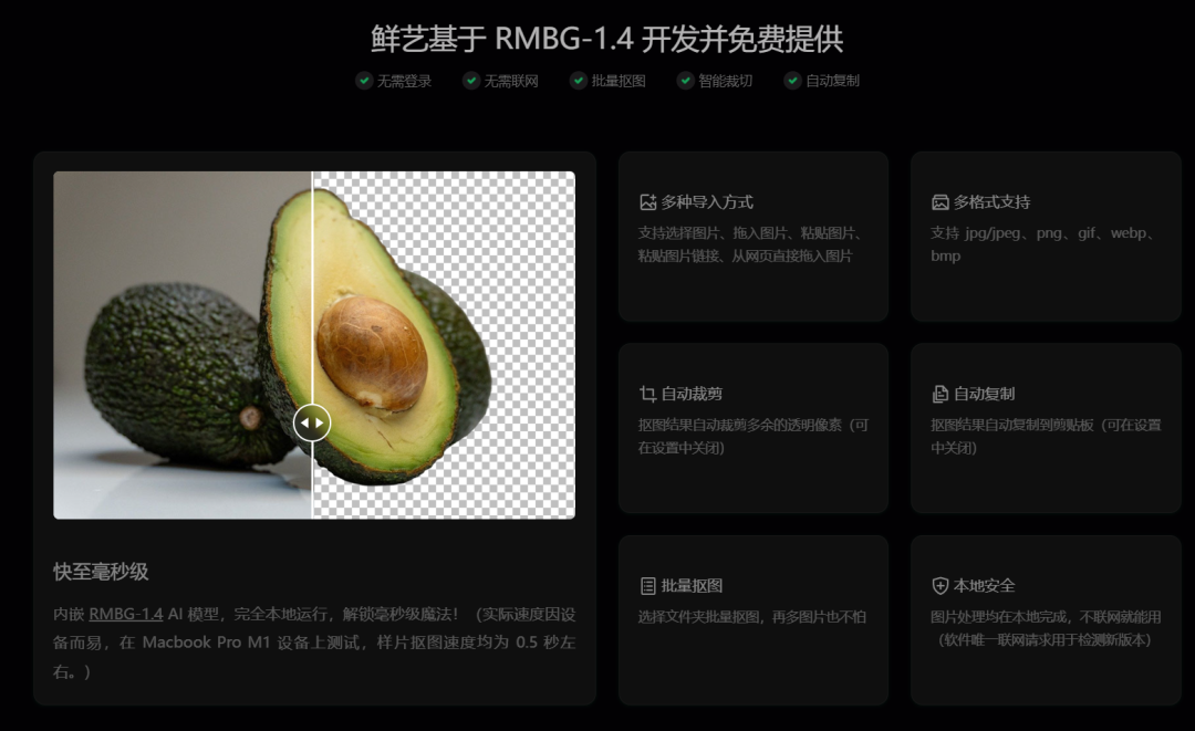 鲜艺AI抠图是一款免费且无需联网的离线 AI 抠图工具,内嵌 AI 模型,快至毫秒级,它通过内嵌的AI模型实现毫秒级快速抠图,支持批量处理和多种图片选择方式,如点击、拖入、粘贴等。该工具兼容Windows和macOS系统,支持jpg/jpeg、png、gif、webp和bmp格式的图片,无需登录或联网即可使用,非常适合需要快速抠图的用户。