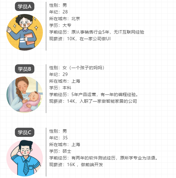在来看看过去两年中,那些30岁左右零基础学员的转行经历。(以下均为真实数据)