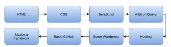 走出这个陷阱的一个方法是制定一个学习路径图。例如,要成为前端开发,你的路径图可能是下图。在将来你能够使用HTML和CSS制作动态页面。