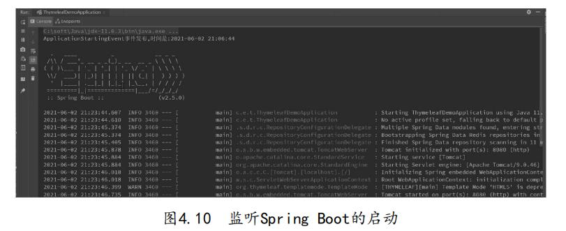 启动项目即可看到监听的Spring Boot启动事件,并在控制台上打印了日志,如图4.10所示。