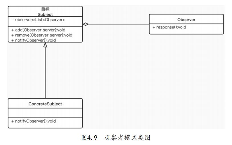 Java的事件机制是一个典型的观察者模式。当对象间存在一对多关系时,则使用观察者模式(Observer Pattern)。当一个对象被修改时,则会自动通知依赖它的对象。观察者模式属于行为型模式,其类图如图4.9所示。