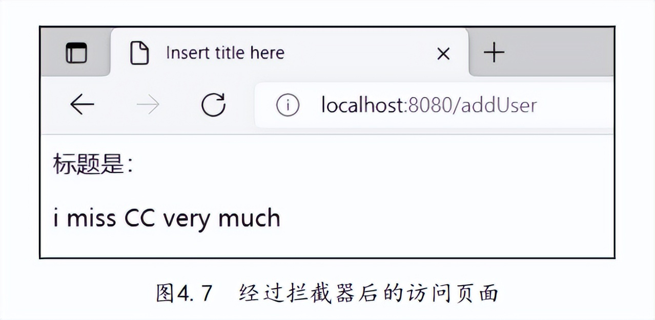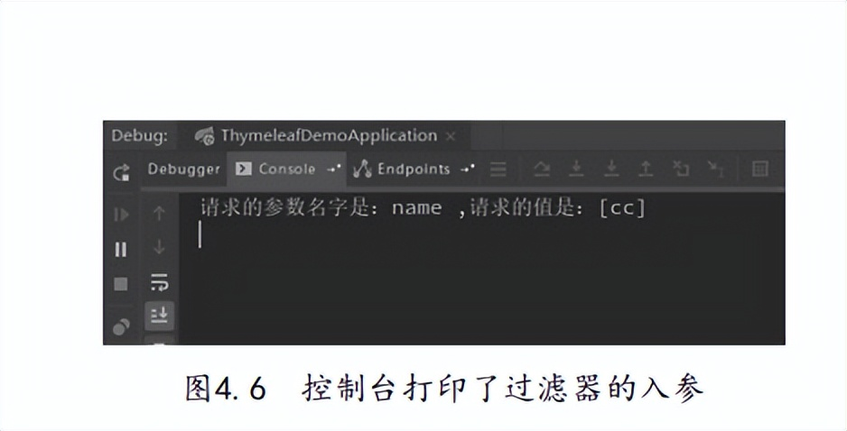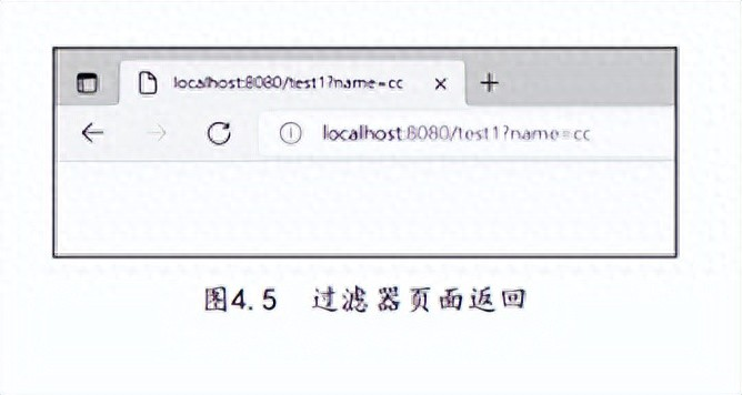 http://localhost:8080/test1?name=cc,页面返回结果如图4.5所示,没有出现业务代码返回的成功提示,查看控制台发现已经打印出入参的参数,如图4.6所示。至此就完成了自定义过滤器过滤请求信息的操作。