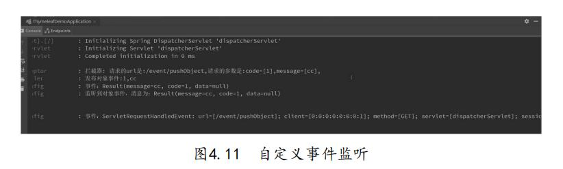 http://localhost:8080/event/pushObject?code=1&message=cc,查看IDEA控制台可以看到打印的Controller被访问的事件监听信息,如图4.11所示。