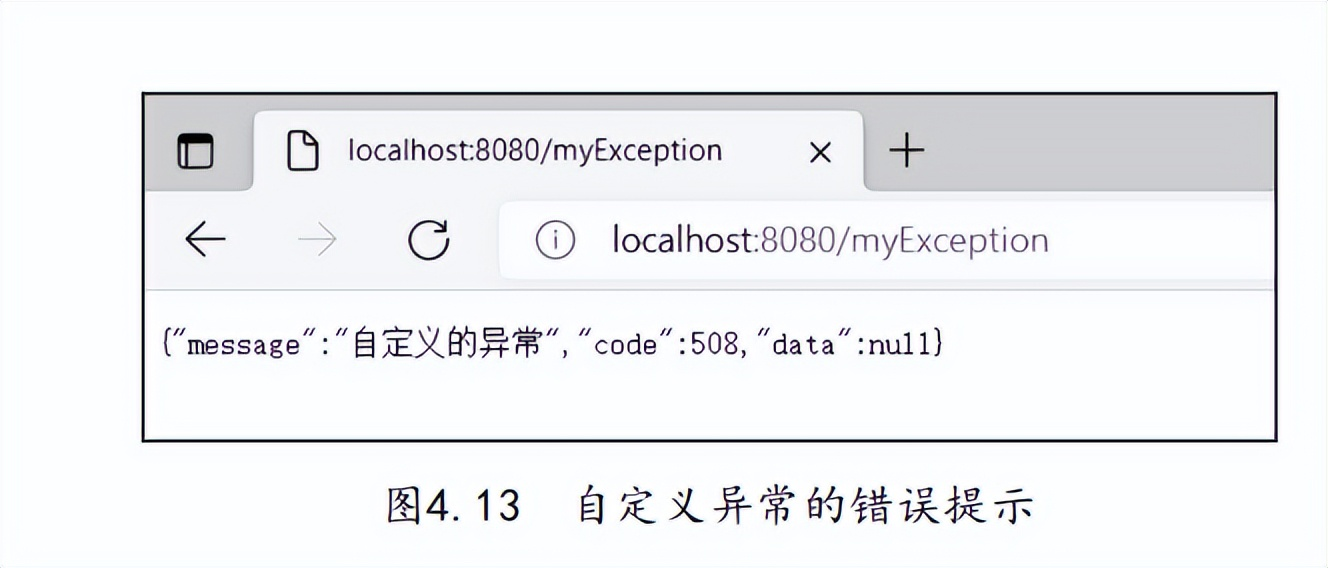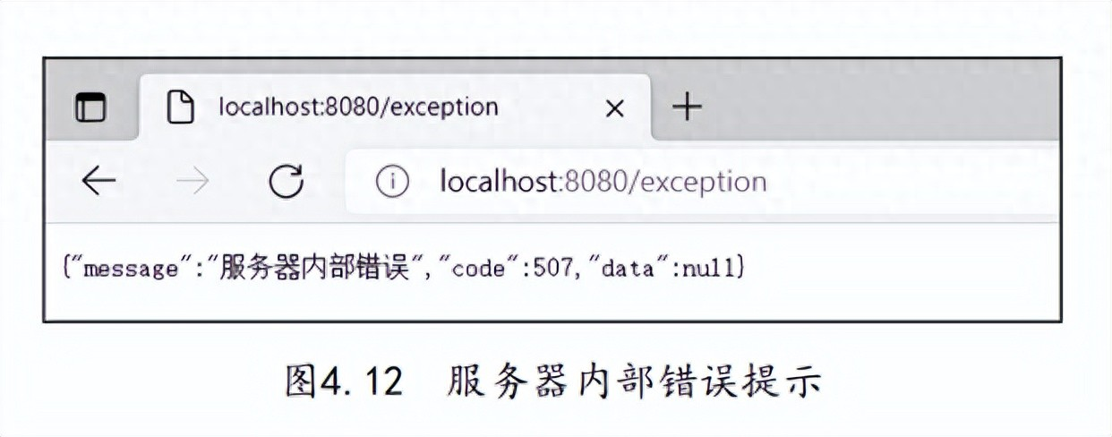 启动当前项目,访问localhost:8080/exception,接口返回的异常信息如图4.12所示。再访问