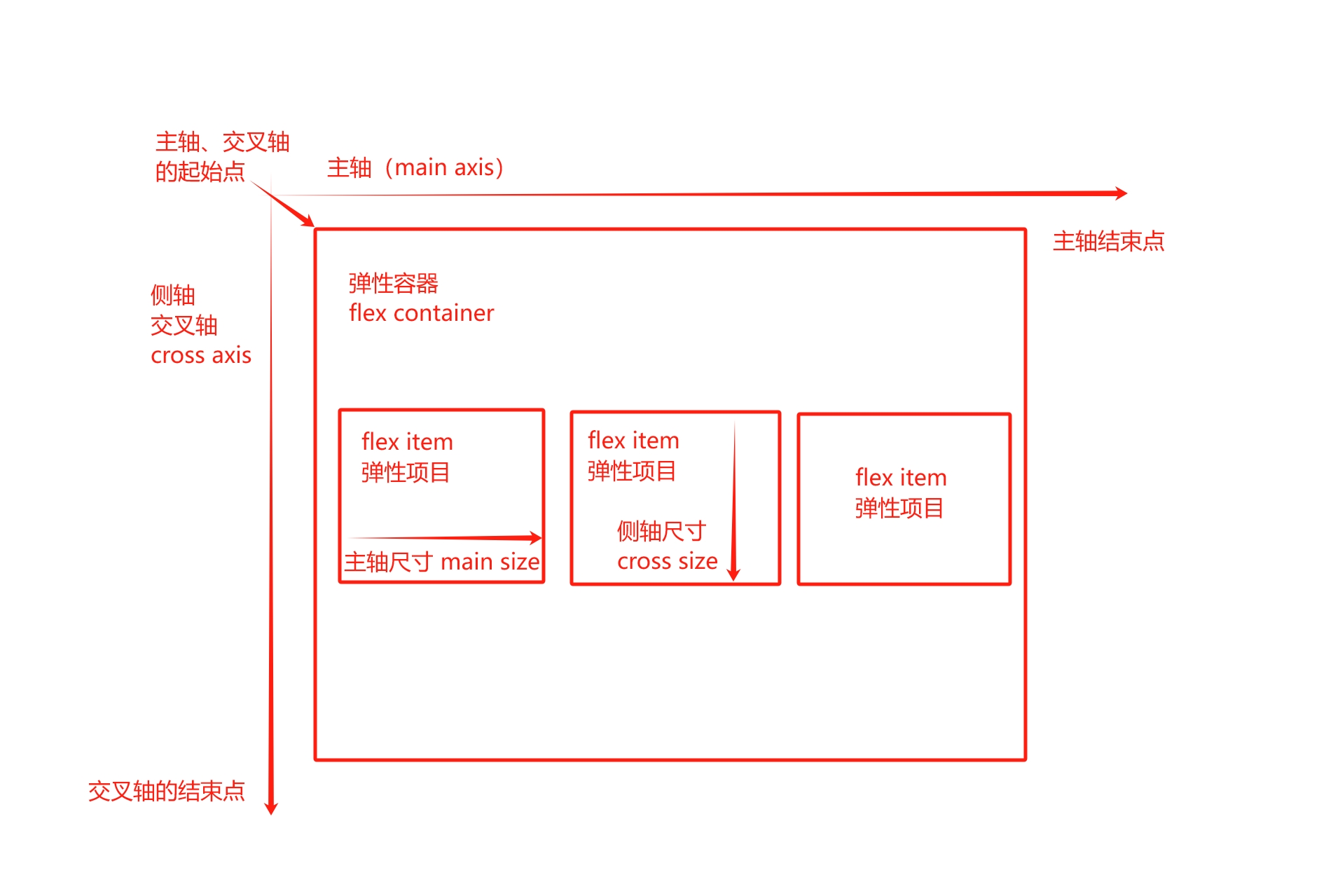 ④ 项目默认沿主轴排列。单个项目占据的主轴空间叫做 main size,占据的交叉轴空间叫做 cross size