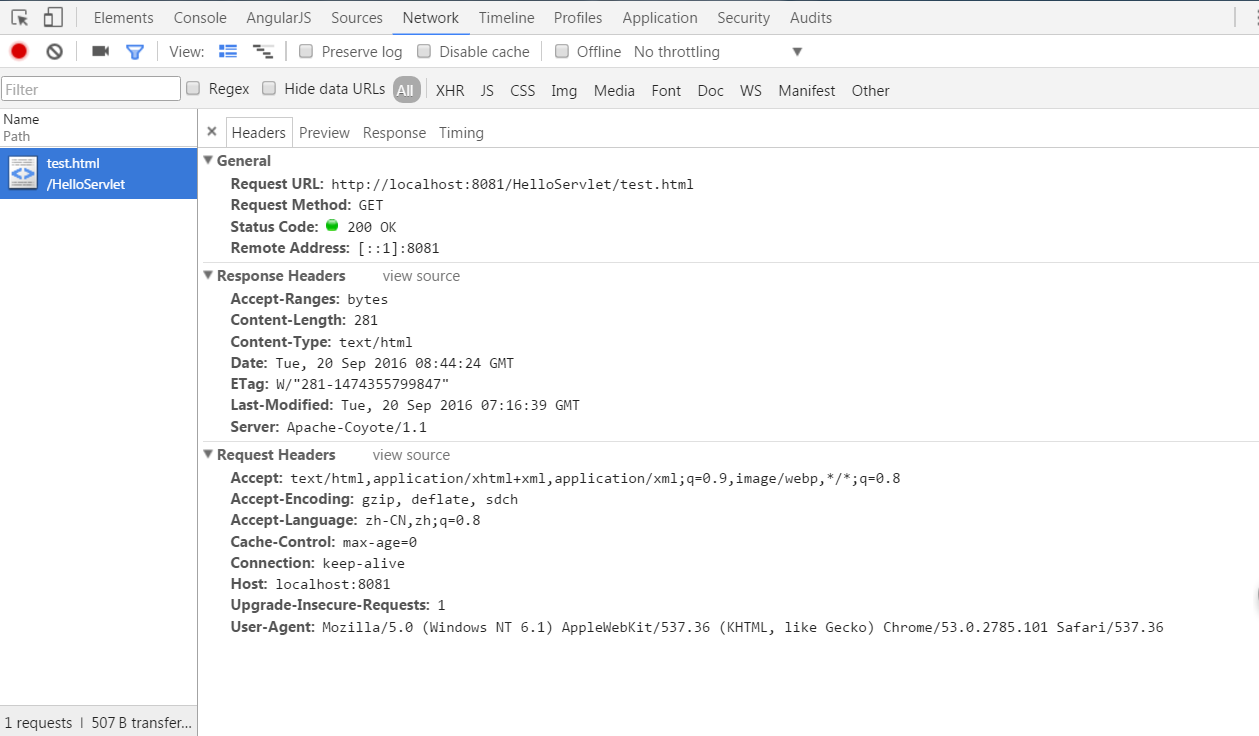 实验开始,先清掉浏览器的缓存,然后在浏览器中输入 localhost:8080/HelloServlet/test.html ,我的图中用的是127.0.0.1的环路地址,是一样的哈。