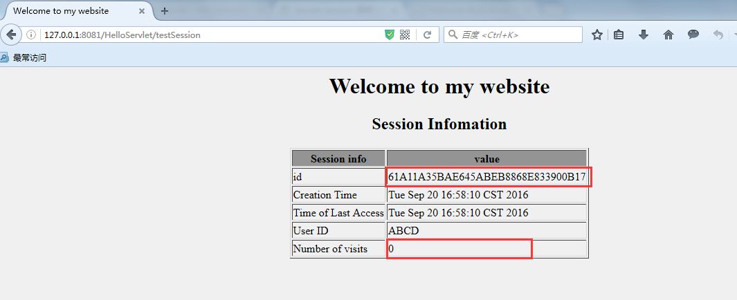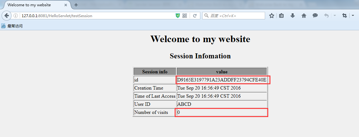 (3)同一浏览器关闭后再次访问也不是同一session,如图5所示,切换到firefox后id和visitCount都不同了。