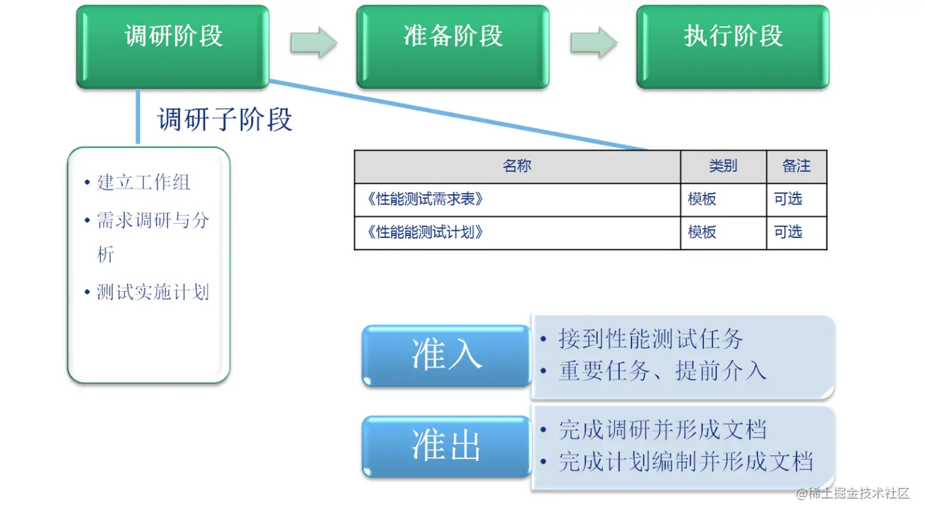 调研阶段的主要工作为:组建工作小组、项目创建、需求分析、模型构建、定制性能测试详细实施计划。