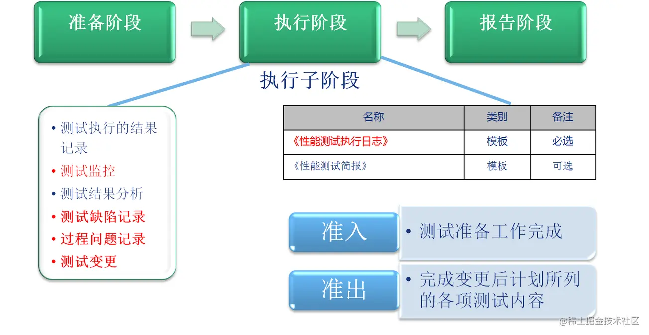 在执行阶段,测试的执行、分析调优、回归测试工作较为反复,须认真记录全部执行过程和执行结果,执行结果数据是分析瓶颈的主要依据。