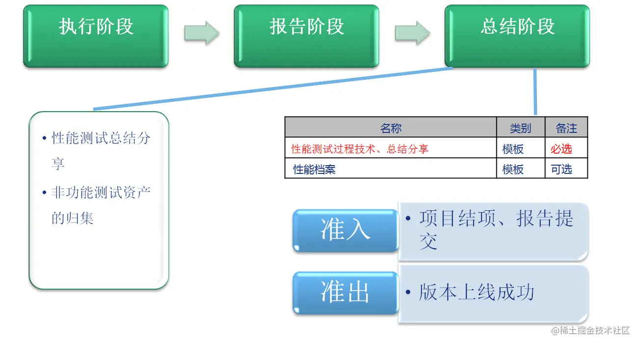 性能测试的总结工作,主要对该任务的测试过程和测试技术进行总结。性能测试工作进入总结阶段,也意味着性能测试工作临近结束。在这个阶段,时间允许的情况下应将所有的重要测试资产进行归档保存。