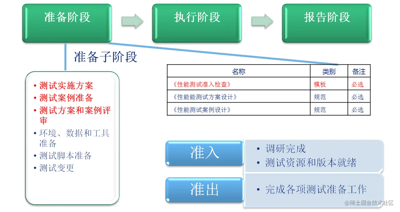测试准备阶段是性能测试工作中重要阶段。在准备阶段,需要完成业务模型到测试模型的构建、性能测试实施方案编写、测试环境的准备、性能测试案例设计、性能测试监控方案设计、性能测试脚本,及相关测试数据的准备,并在上述相关准备活动结束后按照测试计划进行准入检查。