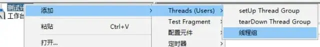 操作:鼠标右键测试计划 -> 添加 -> Threads(Users) -> 线程组 -> 修改测试计划名称