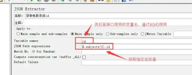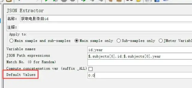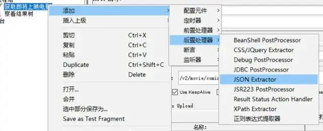操作:将鼠标放置“获取即将上映电影”的HTTP请求上,并按右键 -> 添加 -> 后置处理器 -> JSON Extractor -> 填入变量名等信息