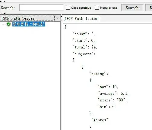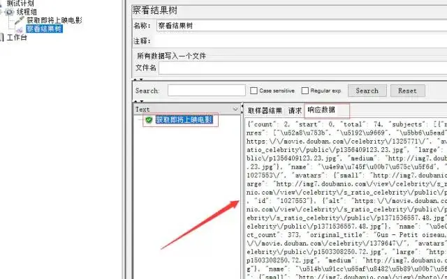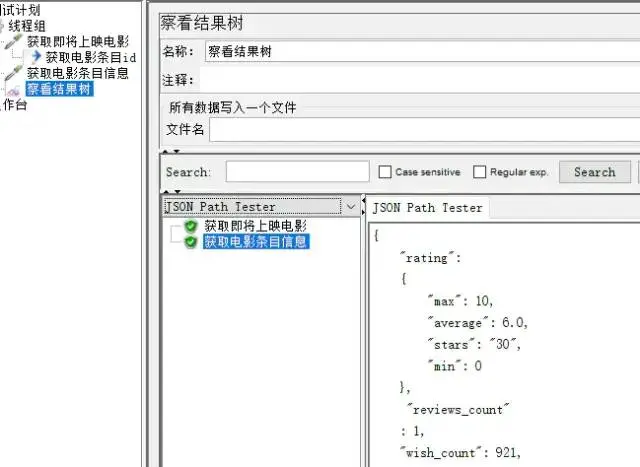 在“察看结果树”中可以看到,获取电影条目信息的HTTP请求中,请求参数正确。同时也得要正确的响应参数。